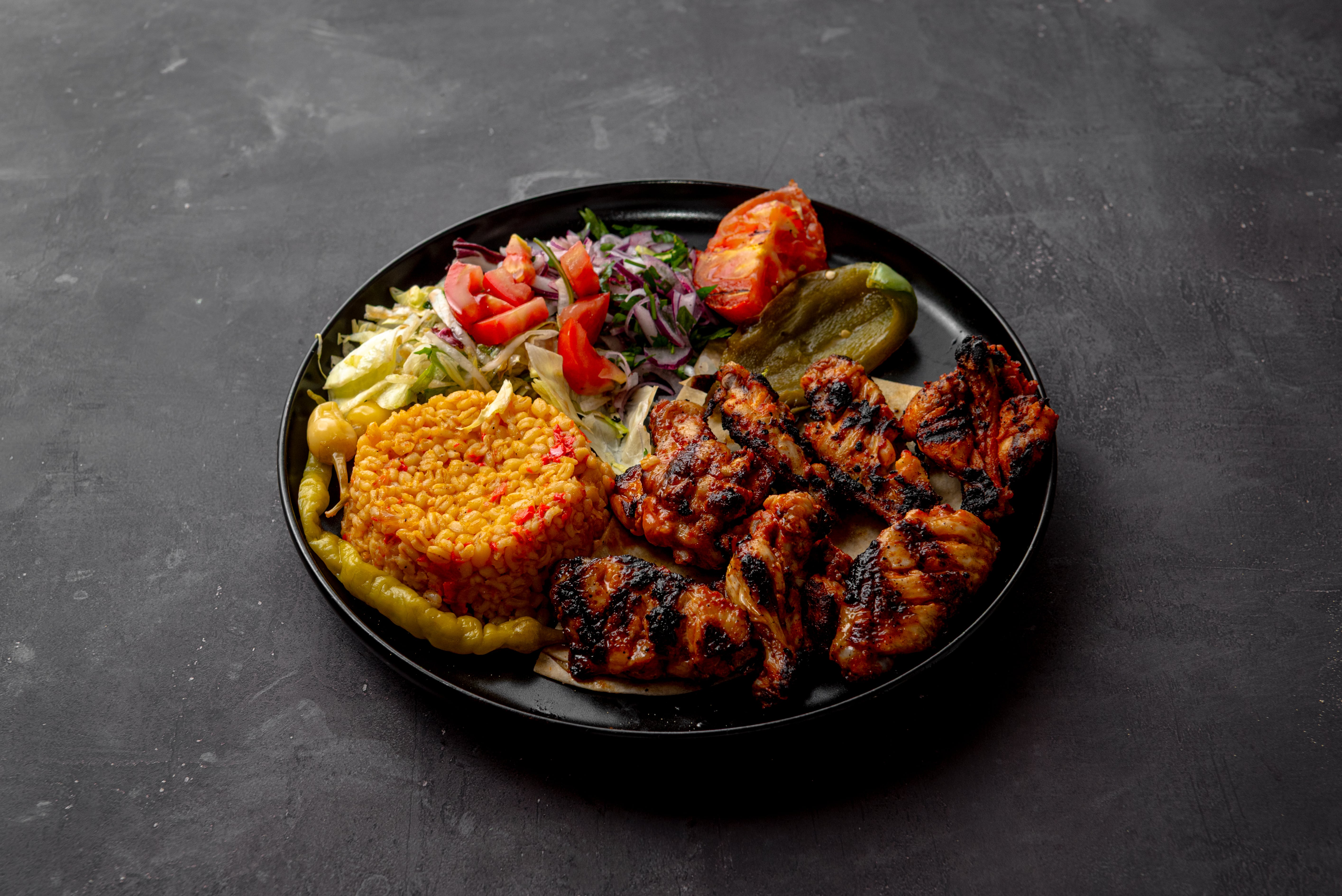 Chicken wings served with lavash, onion and seasonal salad, grilled tomato and pepper. Side Options: Rice Pilaf or Bulgur Pilaf or French Fries