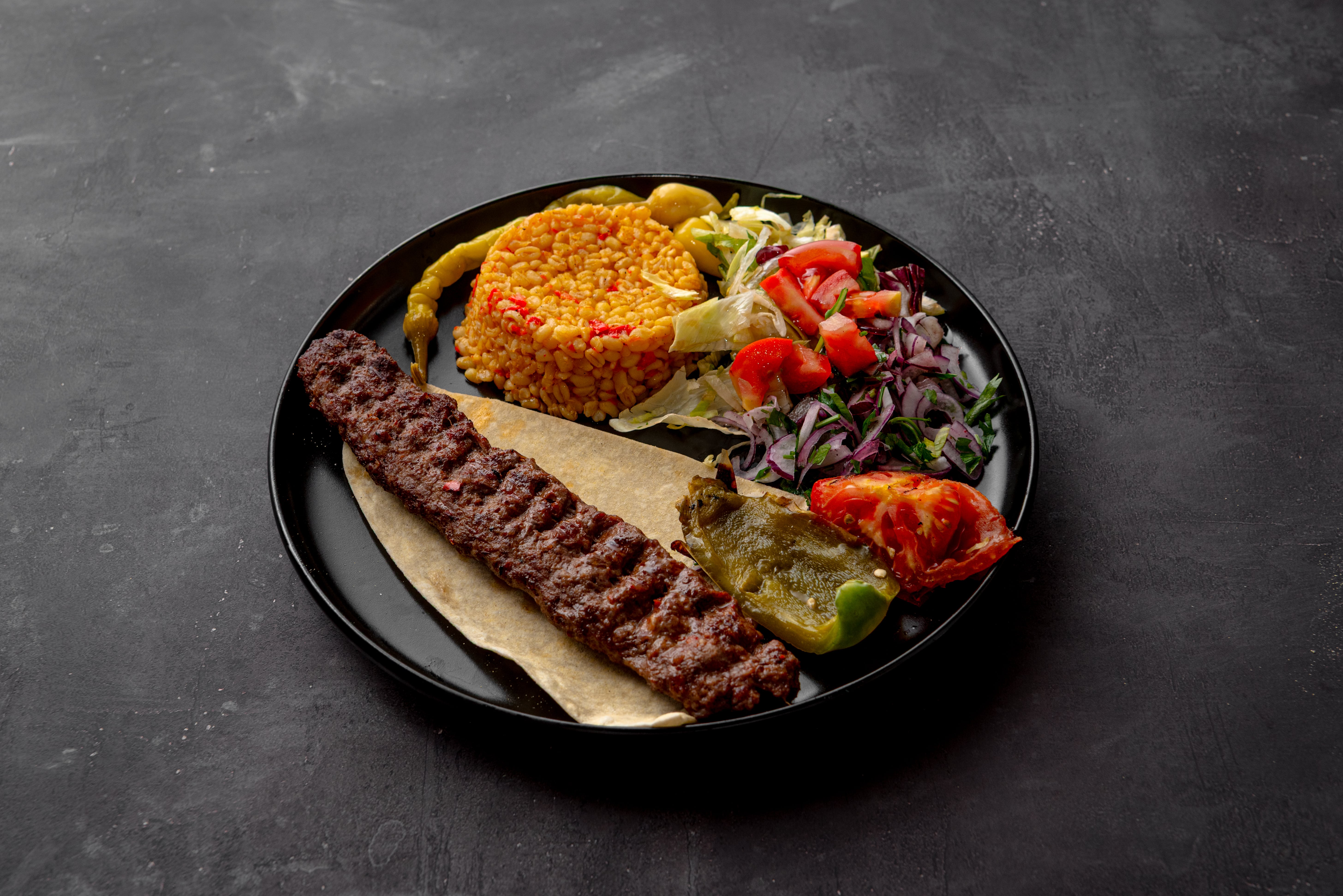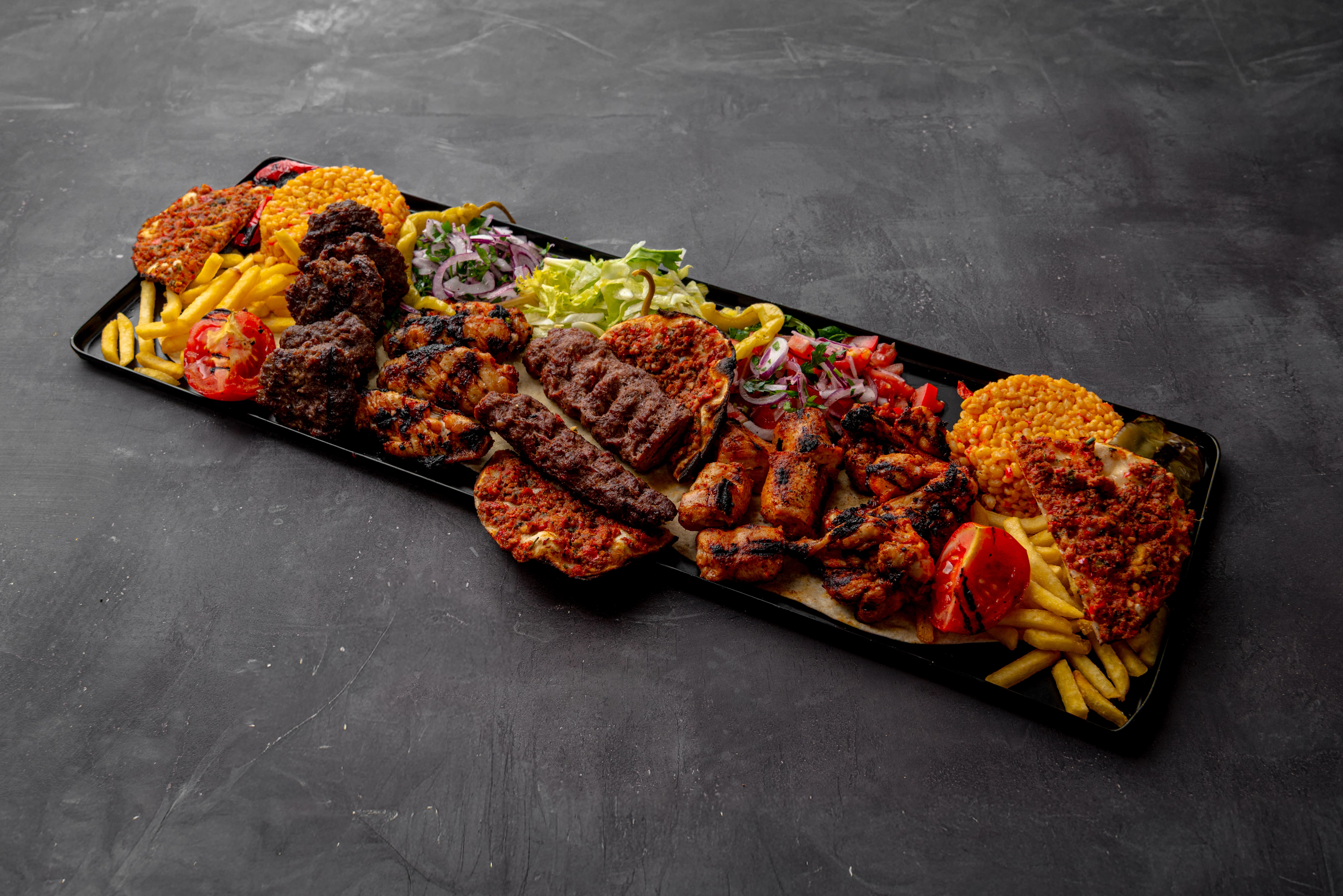 Adana, Meatballs, Wings, Chicken Shish, Mini Lahmacun. Served with lavash, bulgur and rice pilaf, onion, seasonal salad, grilled tomato, grilled pepper and French fries.