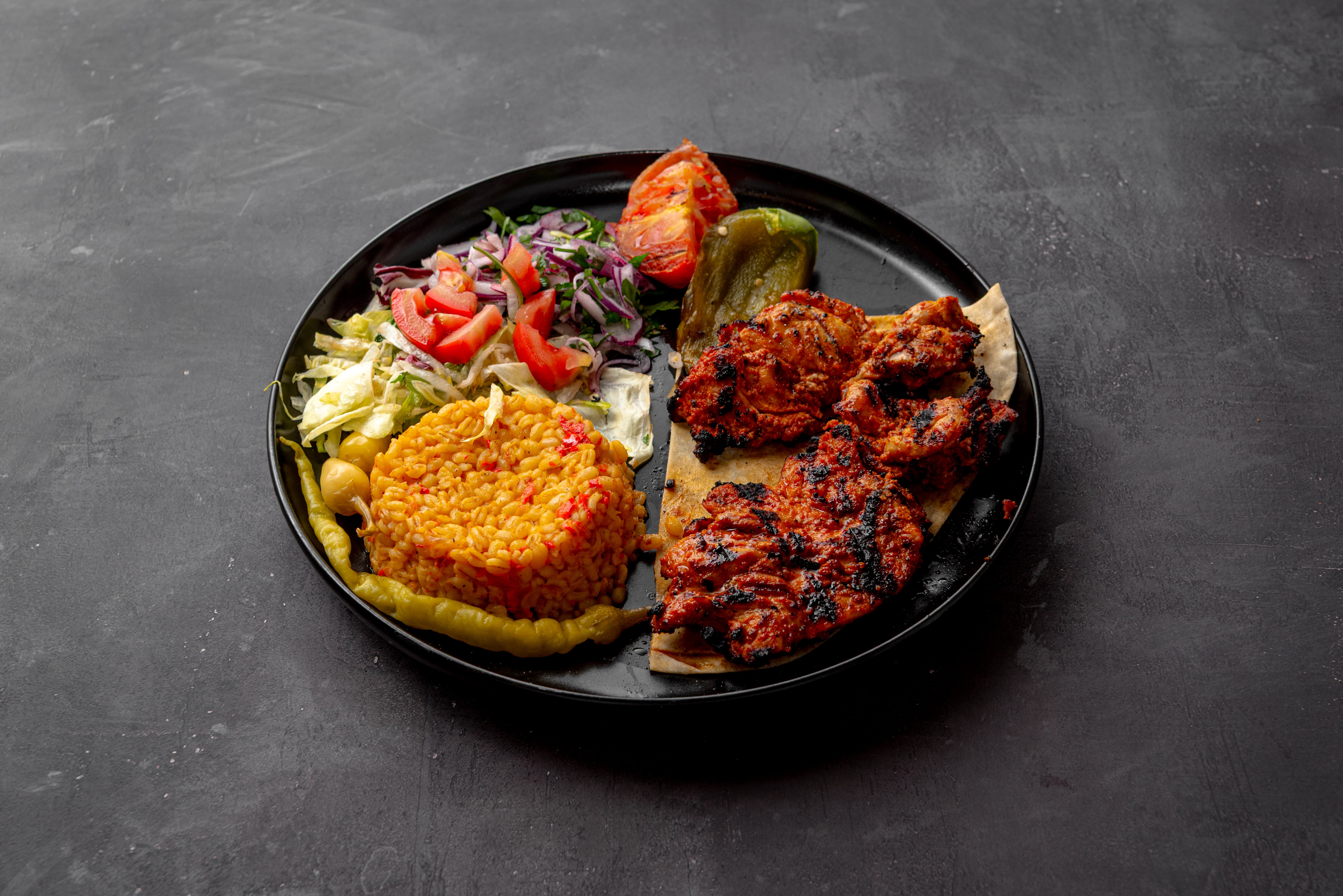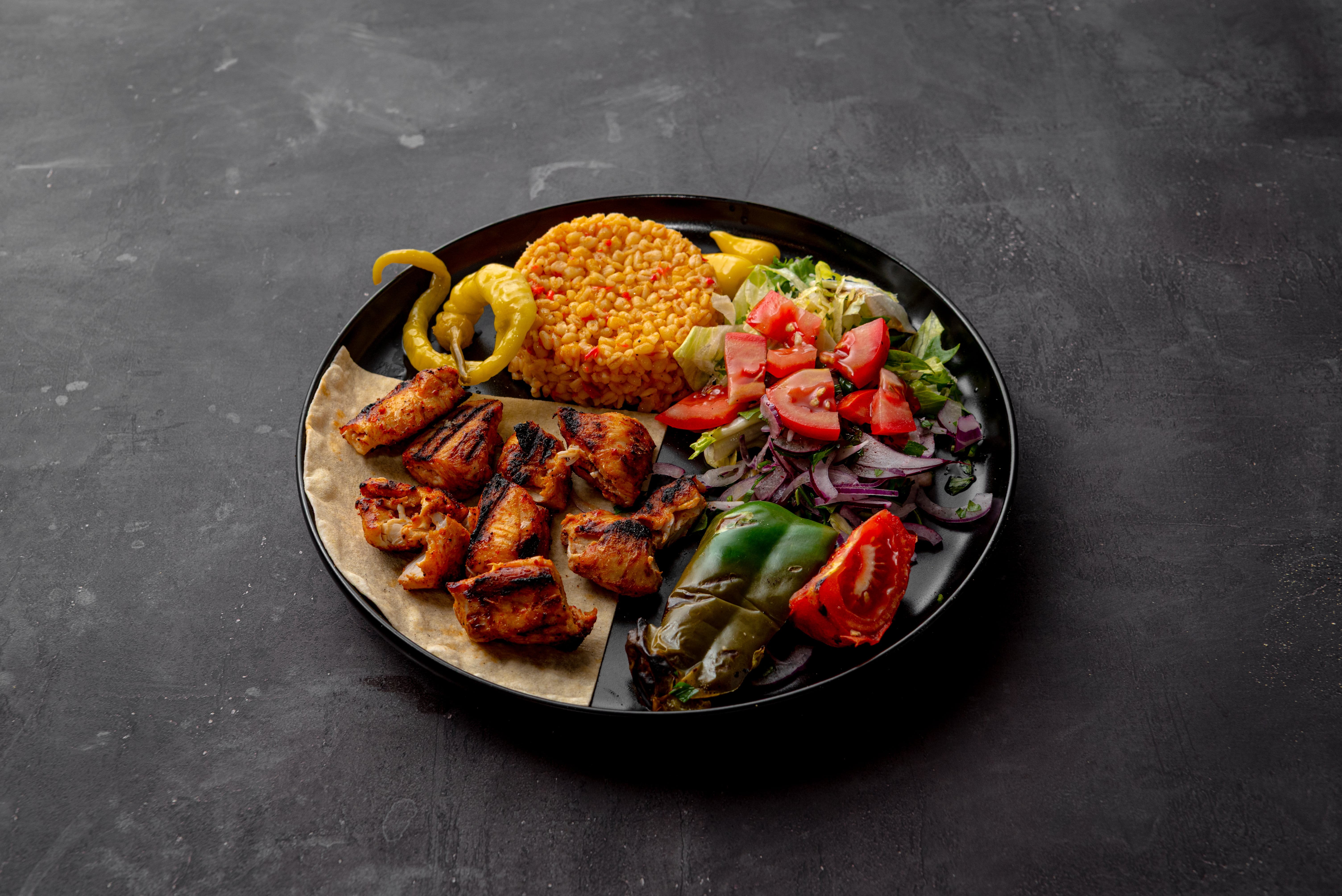Chicken skewers (chicken breast), served with lavash, onion and seasonal salad, grilled tomato and pepper. Side Options: Rice Pilaf or Bulgur Pilaf or French Fries